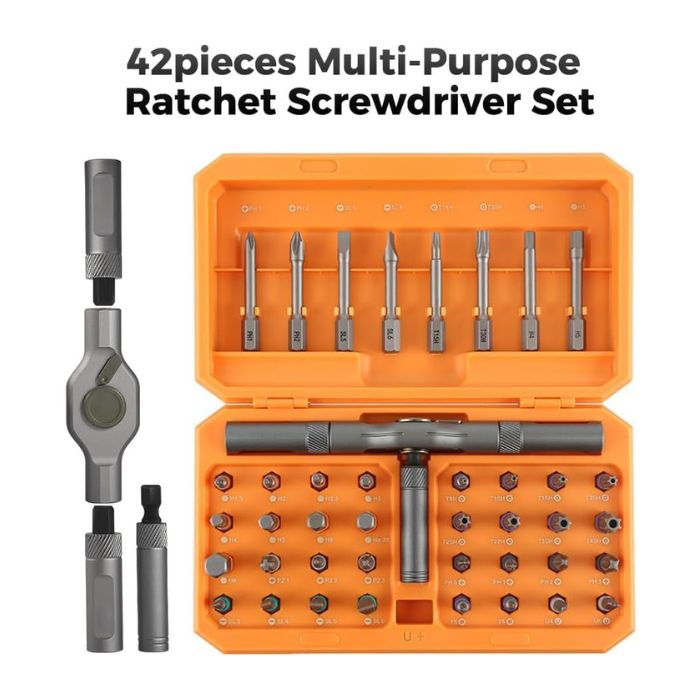 - Aluminum 42 in-1 Ratchet Torque Kit, Ratchet Screwdriver Kit. Our experienced technical team has redesigned the kit, including all the tools needed to repair furniture, including Phillips, Pentalobe, Torx, Hex, JS, Slotted, Triangle, Square, and more.